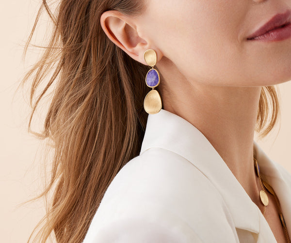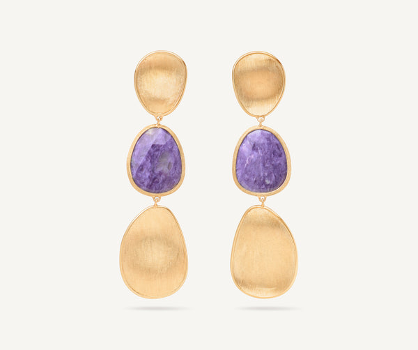 Vibrant and feminine, these triple earrings perfectly balance versatility with understated elegance. The 18K yellow gold leaves are delicately hand-engraved using the ancient Florentine technique, while the central purple charoite leaf features a sophisticated, exclusive cut. The ideal accessory to complete any look with a touch of refined elegance.