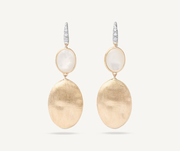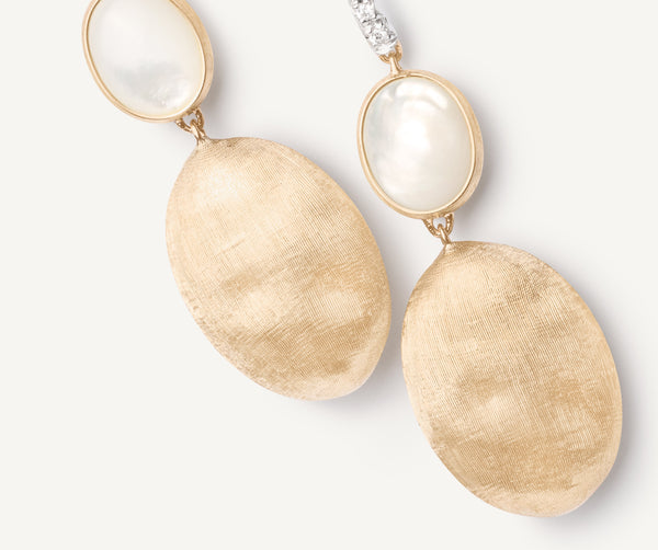 These 18kt gold pendant earrings are characterized by a mother-of-pearl and an oval-shaped element with an irregular surface, finely hand-engraved using the ancient Florentine technique. The hook is adorned with a pav�� of brilliant-cut diamonds.