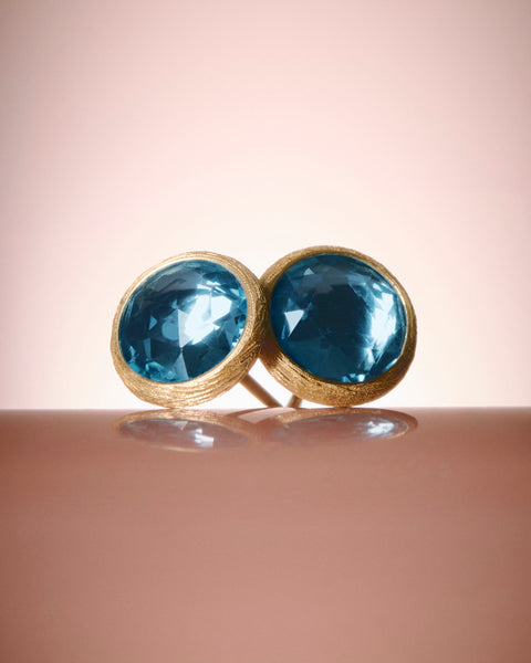 Bright, deep and vibrant in color, these rose-cut sky topaz stud earrings are embellished by an 18kt yellow gold bezel, finely hand-engraved using the ancient Florentine technique.
