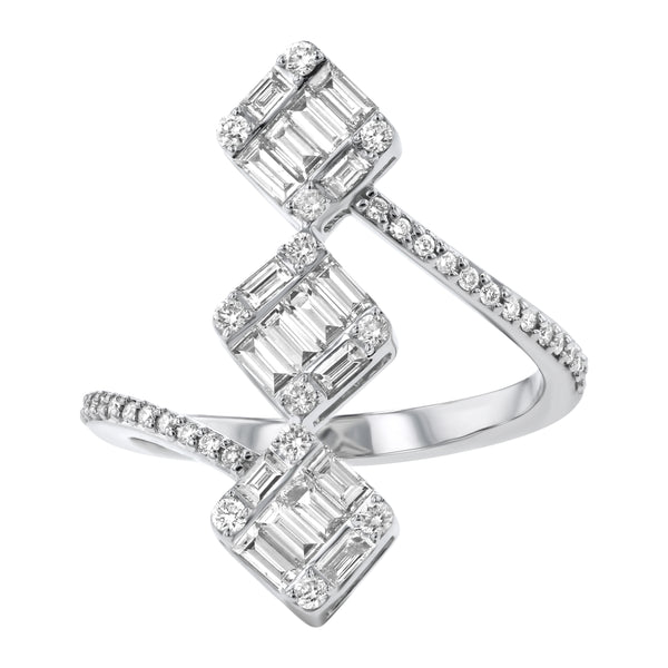 14K white gold 3 squares slanted ring set with 0.85 carats baguette and round brilliant diamonds.