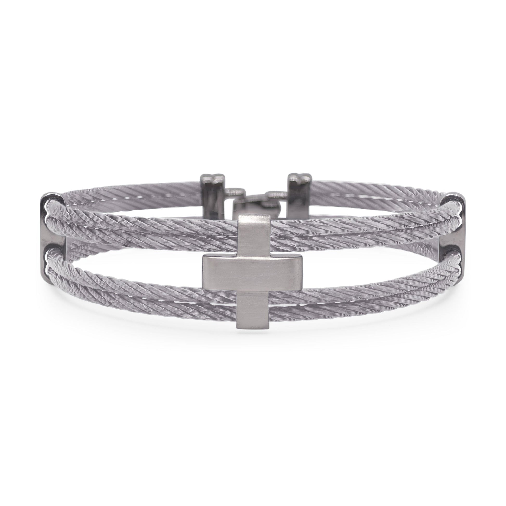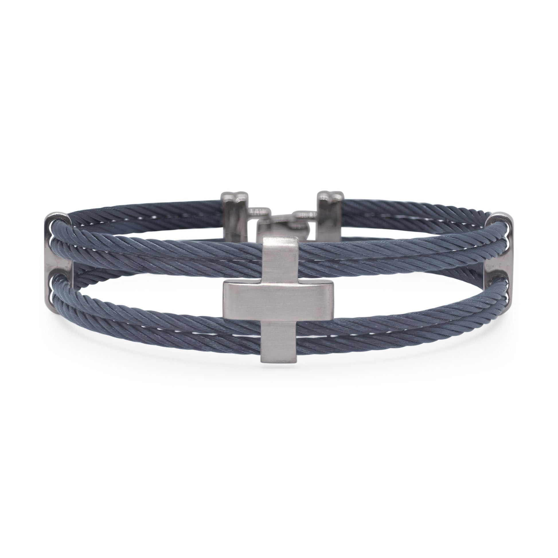 A four row bracelet with a cross station separating cables in the center. Imported.