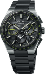 Astron GPS Solar Limited Edition. With the strong, sleek lines of the Seiko Astron, the world’s first commercially available quartz watch, today’s Astron is designed for a new generation of leaders, breaking through to the future with excellence in both innovation and style. Available only in a controlled production run of 1,200, with the production serial number engraved on each caseback, this distinctive Limited Edition combines solid tailoring with the highest degree of accuracy possible in a wristwatch. GPS controlled for high-speed dual time and time zone adjustment to 39 time zones, the solar dual time movement includes an AM/PM indicator, daylight saving time function, time transfer function, power save function, and perpetual day/date calendar correct to the year 2100. The solar cell is powered by light energy, with no battery change required. In black with green accents, the unique pressed pattern dial features dual time, day, 24-hour and multi-function indicator subdials, a date calendar, and LumiBrite hands and markers, and is framed by a bezel with black sapphire crystal insert and coordinating green accents. Crafted of light and durable titanium, in two-tone silver and black with super-hard coating for added endurance, this superb timepiece also offers a sapphire crystal with super-clear coating, secure screwdown caseback and tri-fold push button release clasp. Complete with a coordinating additional bi-color silicone strap, this exceptional timepiece is packaged in a special collectors’ box in a matching color scheme. 10 bar, 100M Water Resistant