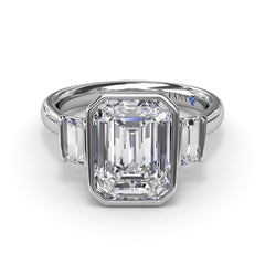 Bezel set center stone and straight baguette side stones paired with a straight bar setting complete this modern three stone engagement ring. This design can be customized based on stone shape and metal preference.