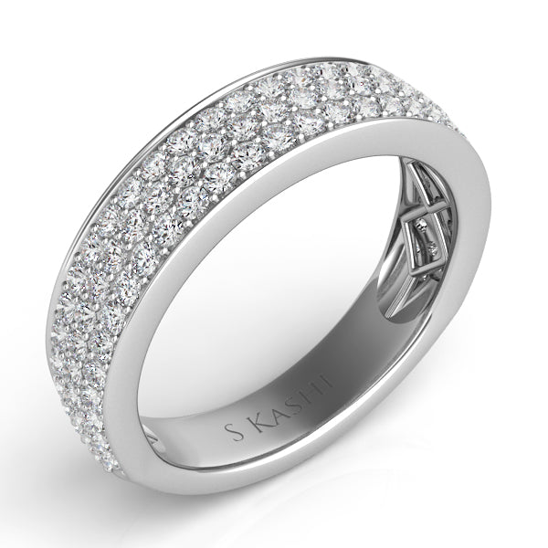 This Band is available in 14K White Gold. There are a total of 85 stones. There are Round with a total carat weight of 0.97 set in a Micro Pave setting.