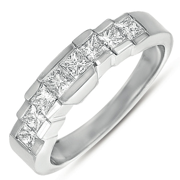 This Band is available in 14K White Gold. There are a total of 8 stones. There are Princess with a total carat weight of 0.75 set in a setting.
