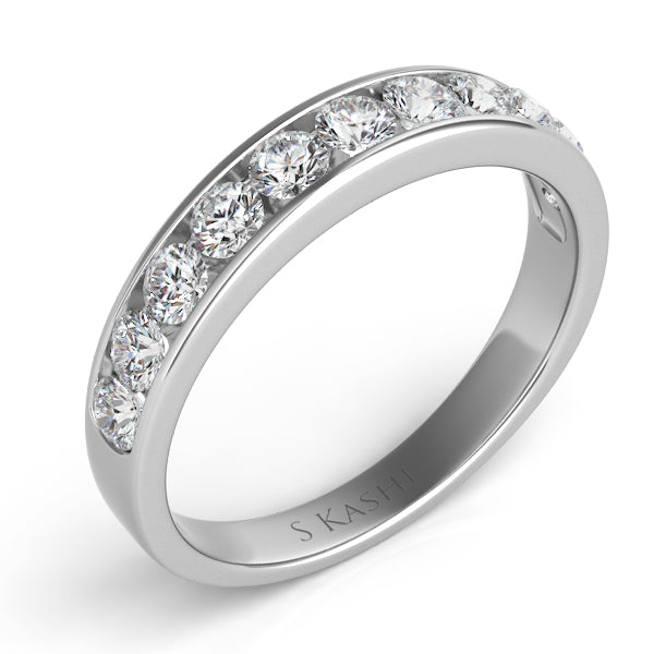 This Band is available in 14K White Gold. There are a total of 11 stones. There are Round with a total carat weight of 0.68 set in a Channel Set setting.
