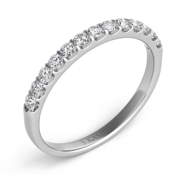 This Band is available in 14K White Gold. There are a total of 13 stones. There are Round with a total carat weight of 0.33 set in a Prong Set|Shared Prongs setting.