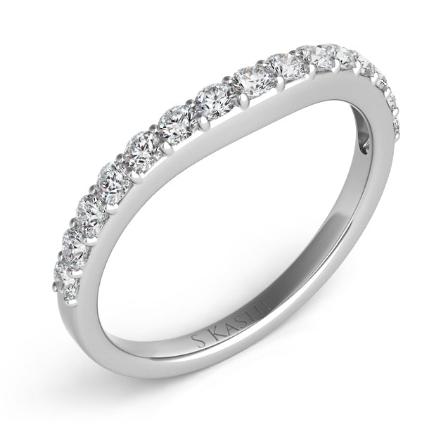 This Band is available in 14K White Gold. There are a total of 15 stones. There are Round with a total carat weight of 0.45 set in a Prong Set setting.