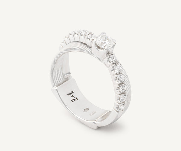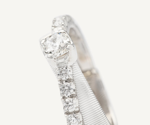 In this elegant 18K white gold ring, a carefully selected 0.33 ct cushion-cut diamond is nestled on flat coil thread, finely hand-crafted with the brands exclusive coil technique, and surrounded with an elegant brilliant-cut diamond band. The result is a refined and timeless ring perfect for a heartfelt gift.