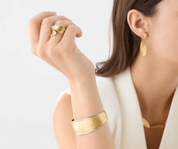 The iconic leaf motif reimagined with a refined twist. This 18kt yellow gold band ring has been finely hand-engraved granting extraordinary lustre and framed by a fine thread of contrasting polished gold and embellished with a delicate diamond pav. Its fluid silhouette gracefully embraces the finger, blending comfort with sculptural elegance.