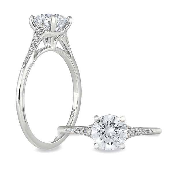 A simple but elegant band, it features a solitaire head with shoulders featuring 3 diamonds. A thin band makes the most of your center. The intricate detail seen only from the side is a trademark of Peter Storm.