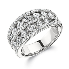 Two rows of princess cut diamonds set point-to-point, suspended between three rows of small white diamonds.