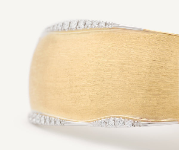 An irregular 18kt yellow gold band wraps around the wrist: the surface is hand-embossed and finely hand-engraved using the ancient Florentine technique. Its irregular profiles are embellished by a delicate pav�� of brilliant-cut diamonds, echoing the organic lines of the design and adding a refined touch of light. ��