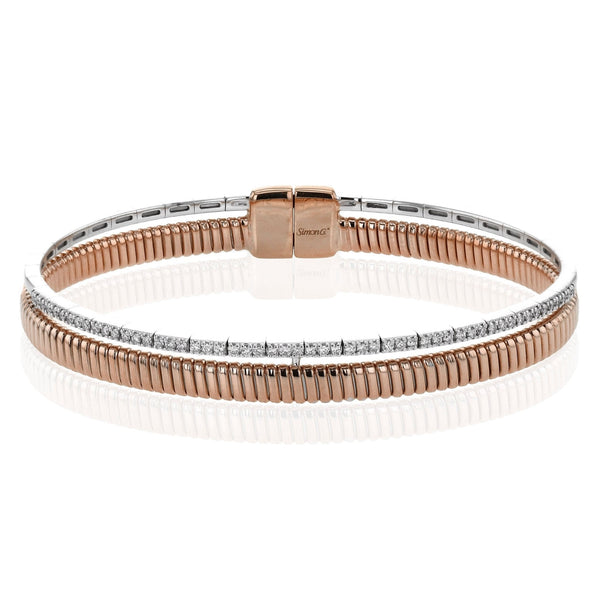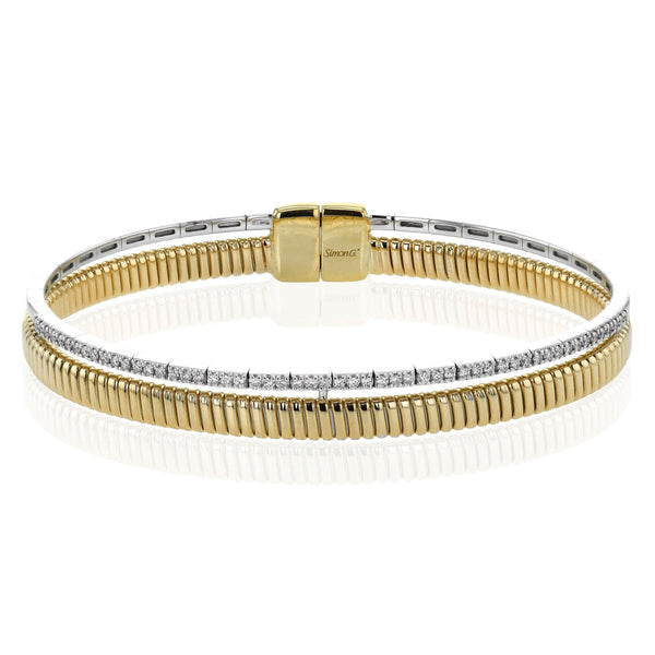 This exquisite 18k gold bangle features a unique ribbed texture and a row of dazzling diamond.