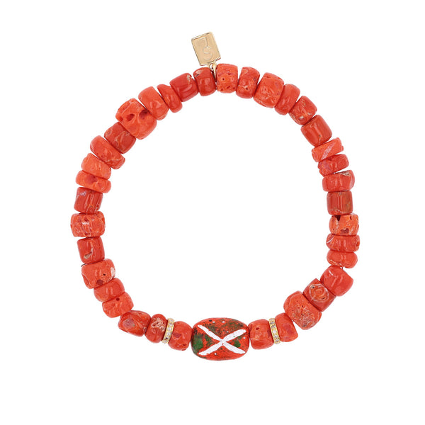 14k Antique Red Coral Beaded Bracelet with African Bead & Diamond Rondelles - One of a Kind