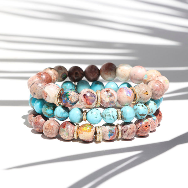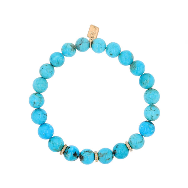 14k Arizona Turquoise Beaded Bracelet with Three Diamond Rondelles - 8mm