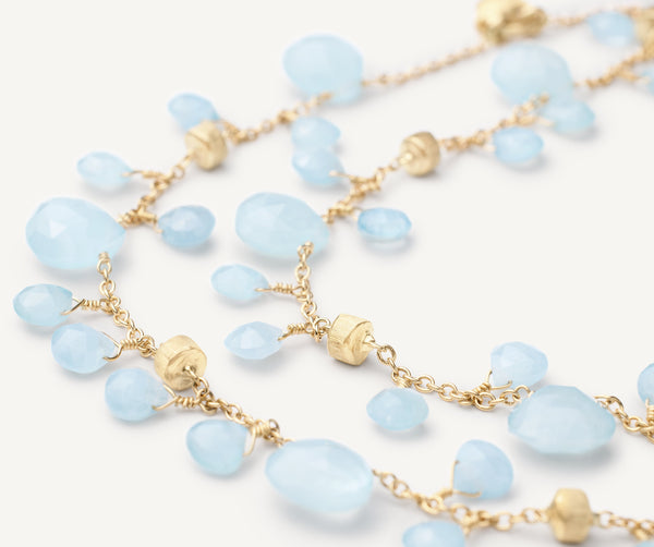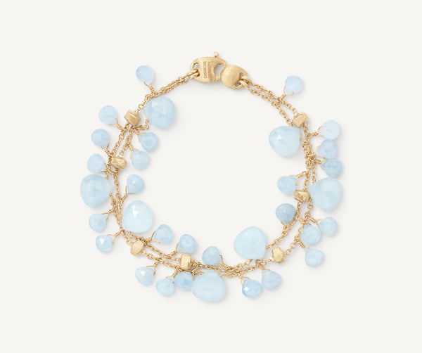 This elegant 18K yellow gold double-strand bracelet is embellished with carefully selected heart-cut milky aquamarines. The 18K yellow gold nuggets are finely hand-engraved using the ancient Florentine technique. Versatile and perfect for adding a touch of colour to any outfit.