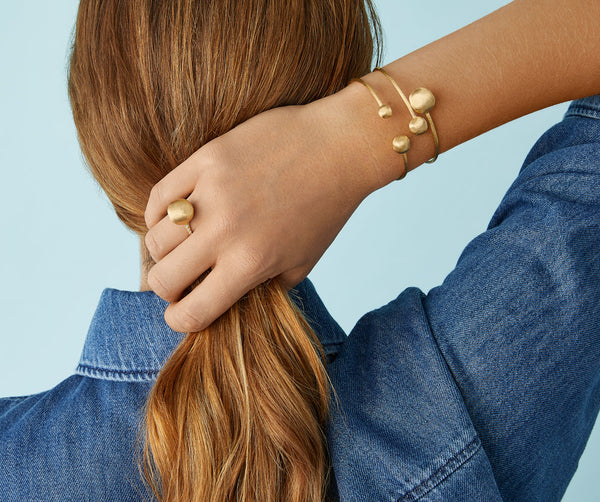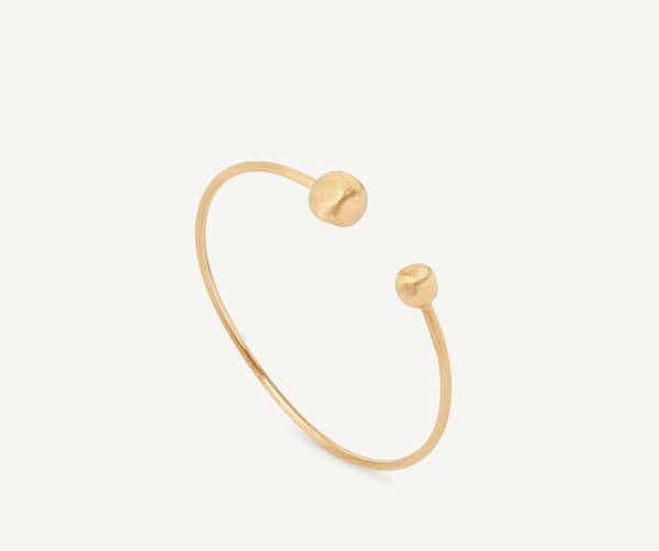 The thin 18kt yellow gold bangle bracelet features beaded ends, finely hand-engraved with an ancient Florentine technique. This cuff flexes around the wrist elegantly and is the perfect addition to a stackable look.