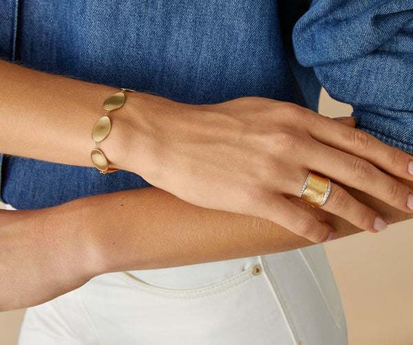 This elegant bracelet with a light, irregular surface is made up of a sequence of 18kt yellow gold leaves, finely hand-engraved using an ancient Florentine technique which provides a very tactile finish. Fascinating and extremely classy.