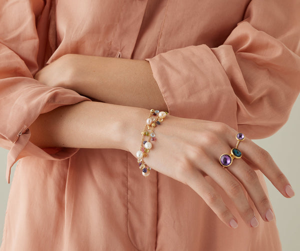 A vibrant mix of colours characterizes this beautiful multi-strand bracelet. The colourful gemstones feature the typical heart-cut, and the multicoloured freshwater pearls stand out for their elegance and lustre. The tiny golden beads are hand-engraved using an ancient Florentine technique.