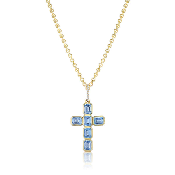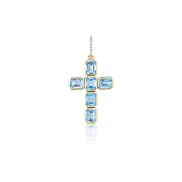 Six emerald-cut aquamarine stones that are bezel set in 14k gold make this 28mm x 40mm cross pendant a true stunner. The 14k gold pave diamond bale completes this pendant with just the right amount of sparkle.