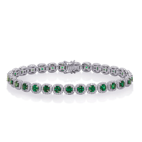 This Bracelet is available in 14K White Gold. There are a total of 495 stones. There are Emerald with a total carat weight of 4.91 set in a Micro Prong|Prong Set|Shared Prongs setting.There are Round stones with a total carat weight of 1.85 set in a Micro Prong|Prong Set|Shared Prongs.