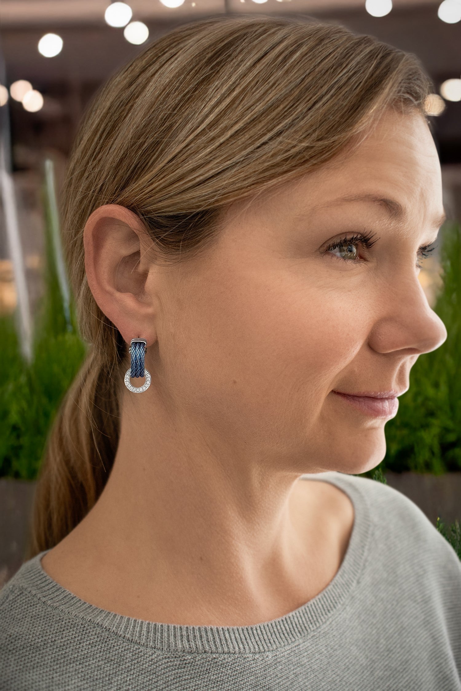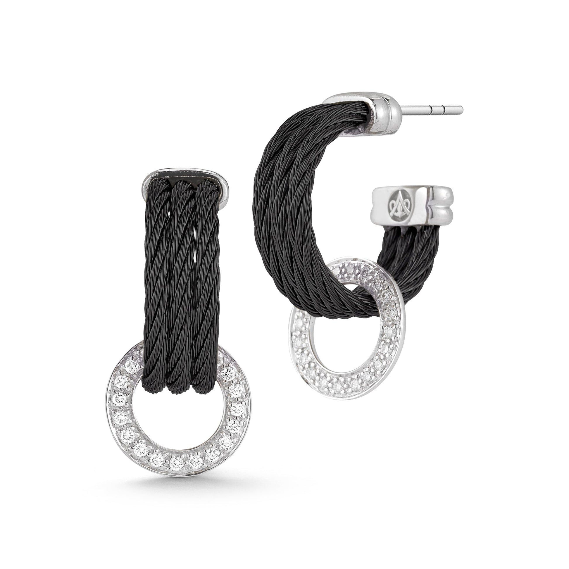Three rows of cable form a 3/4 hoop with a dangling open circle made of diamonds and 14kt gold. The open circle of diamonds can be removed to convert earrings into a simple cable hoop.