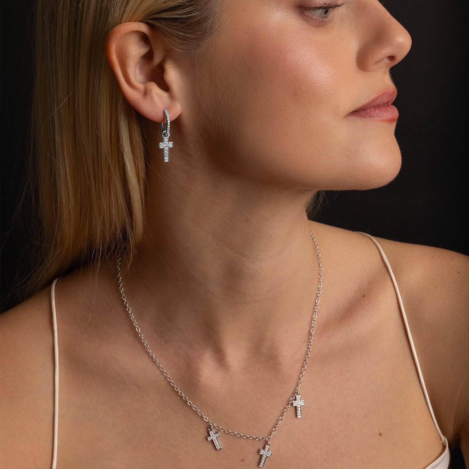Diamond Cross Charm on Diamond Huggie Earrings