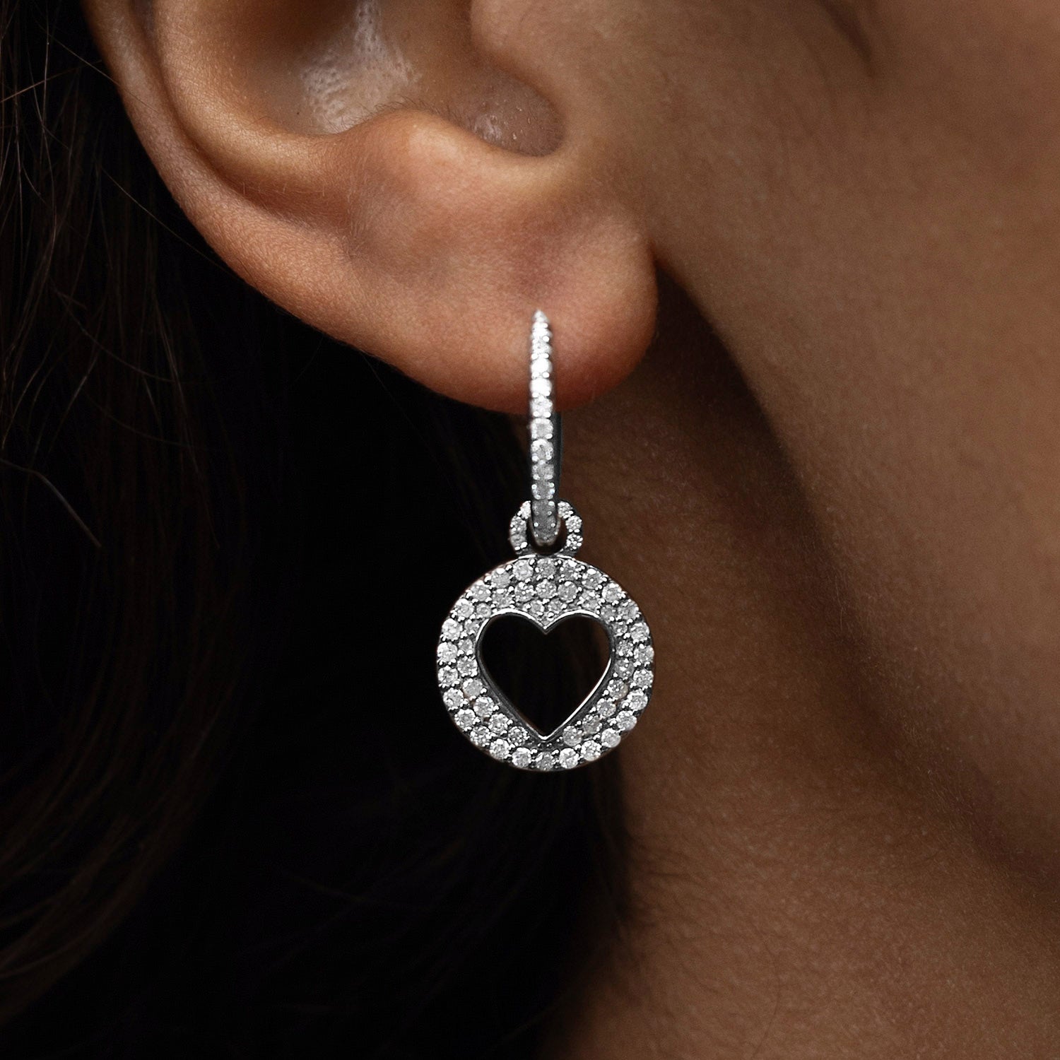 Diamond Open Heart Charm Drops on Diamond Huggie Hoop Earrings