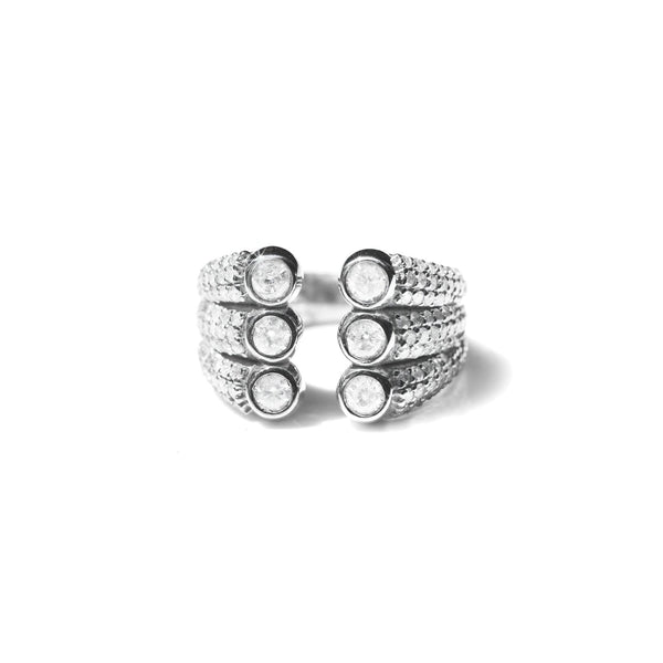 Six round diamonds are set in silver bezels and stacked at the top of three diamond coils that wrap the finger in sparkle.