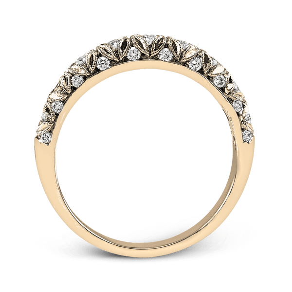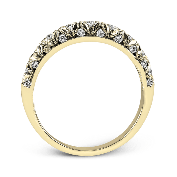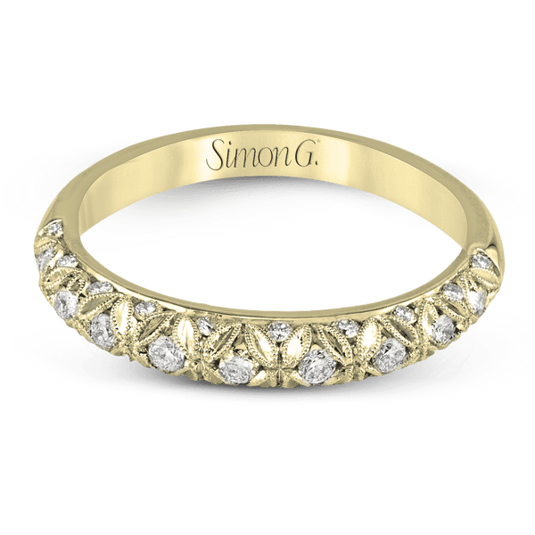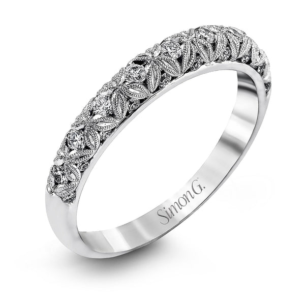 This intricate band has a floral, nature-inspired design adorned with sparkling diamonds.