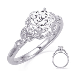 This Engagement Ring is available in 14K White Gold. There are a total of 14 stones. There are Rounds with a total carat weight of 0.08 set in a Micro Prong setting.