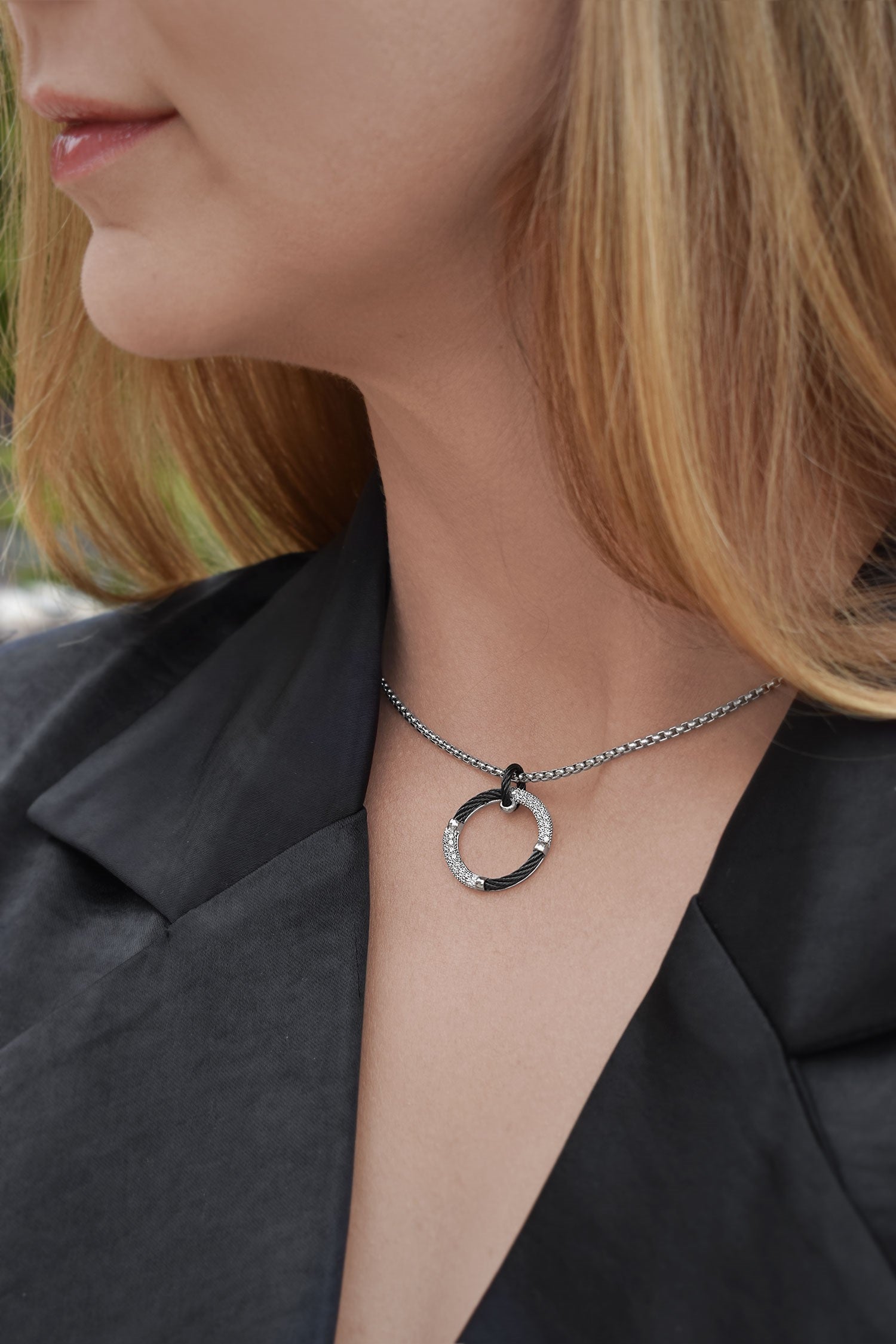An open circle pendant of twisted cable with details of diamonds and 14kt gold on a box chain necklace.