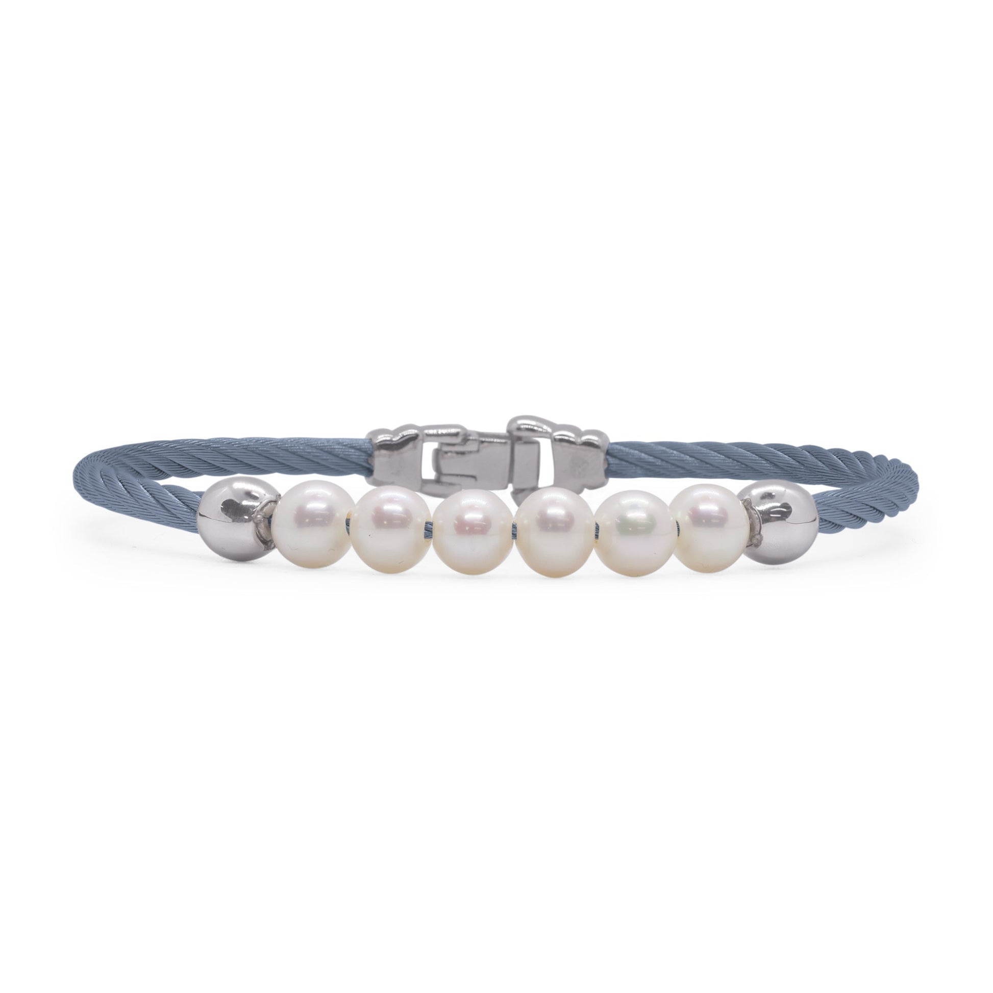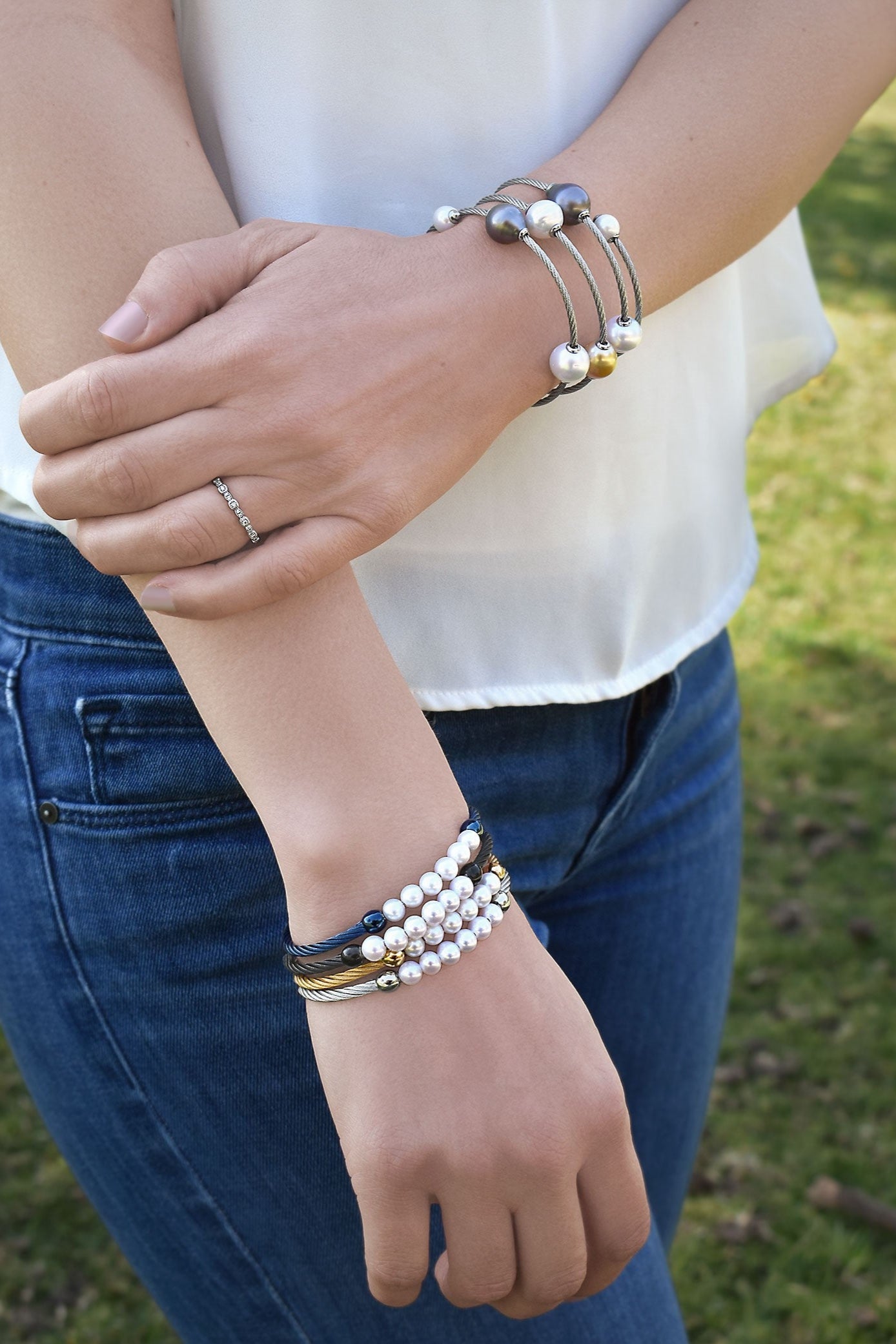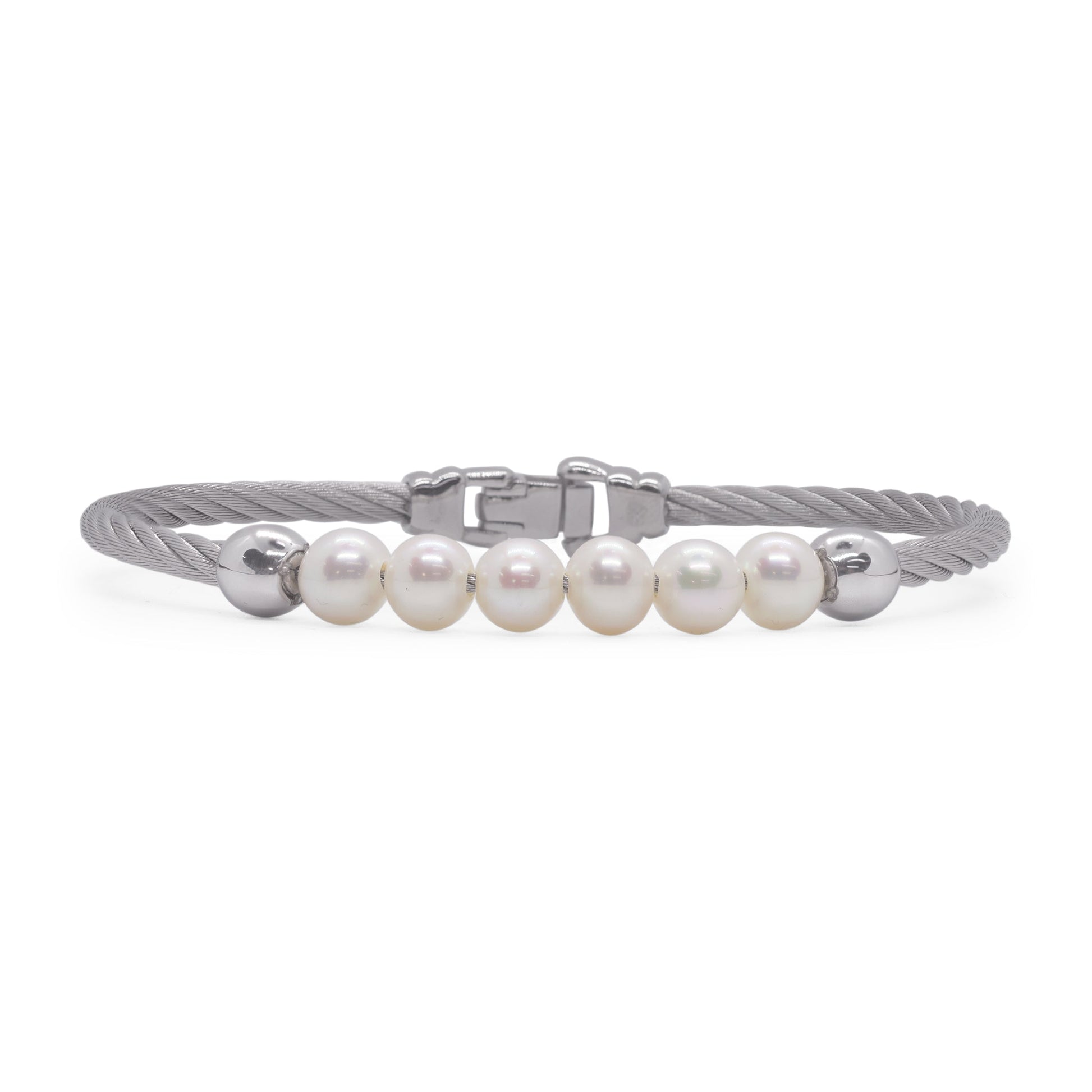 A row of Freshwater pearls with two beads on either side are strung on a cable bracelet.