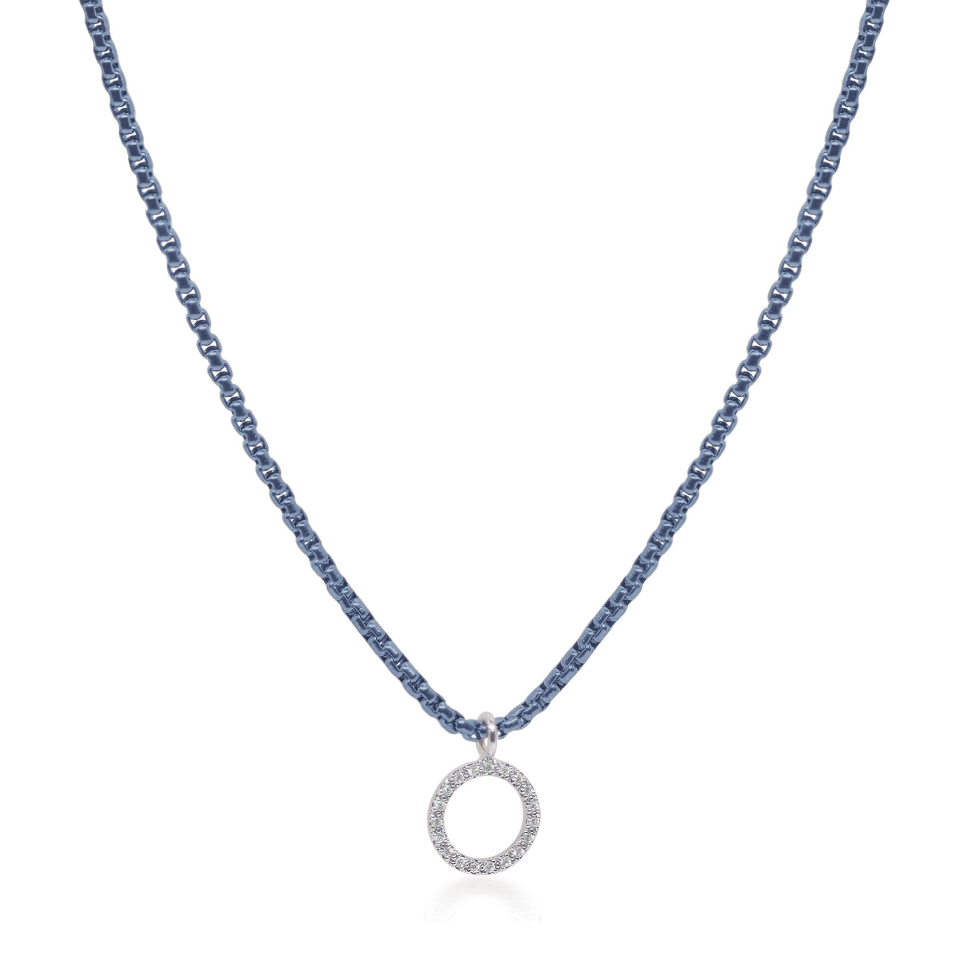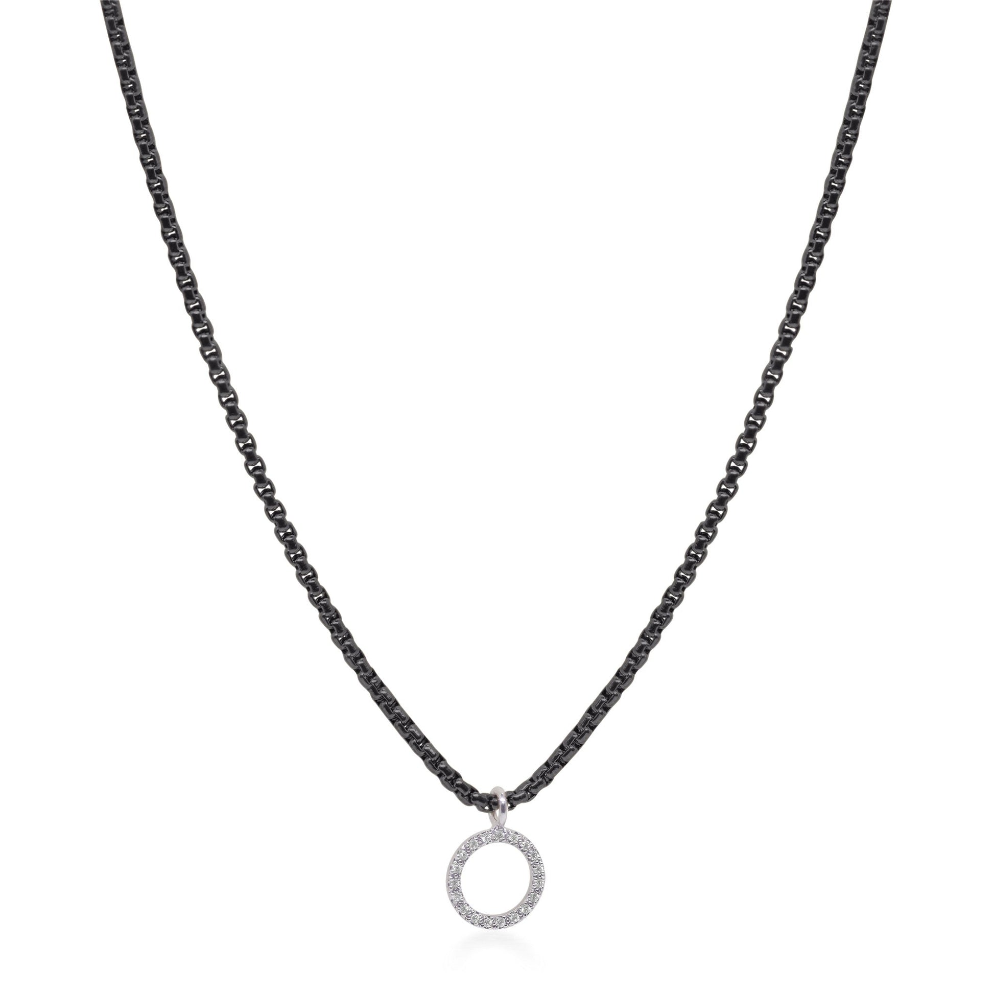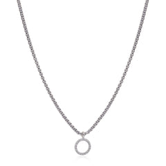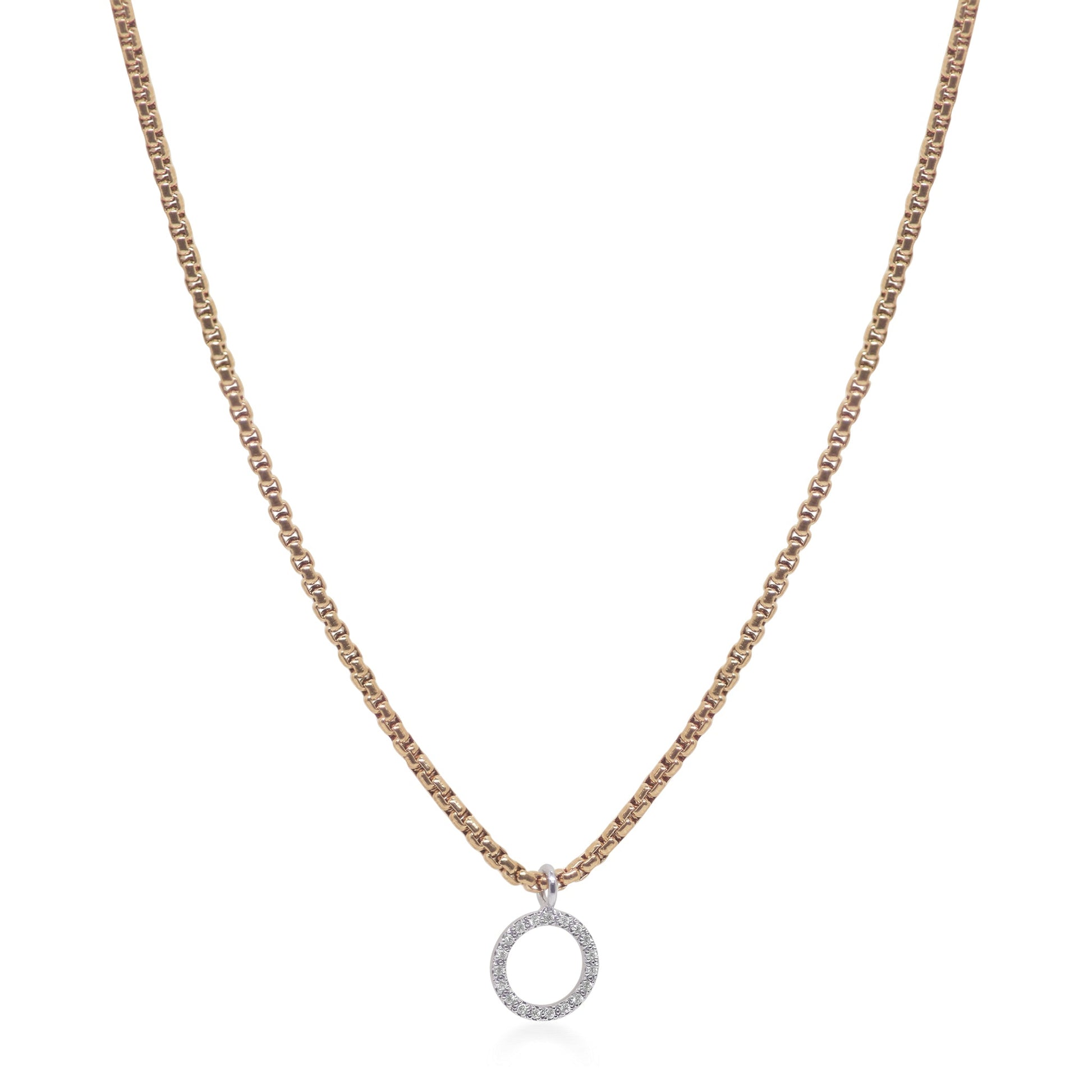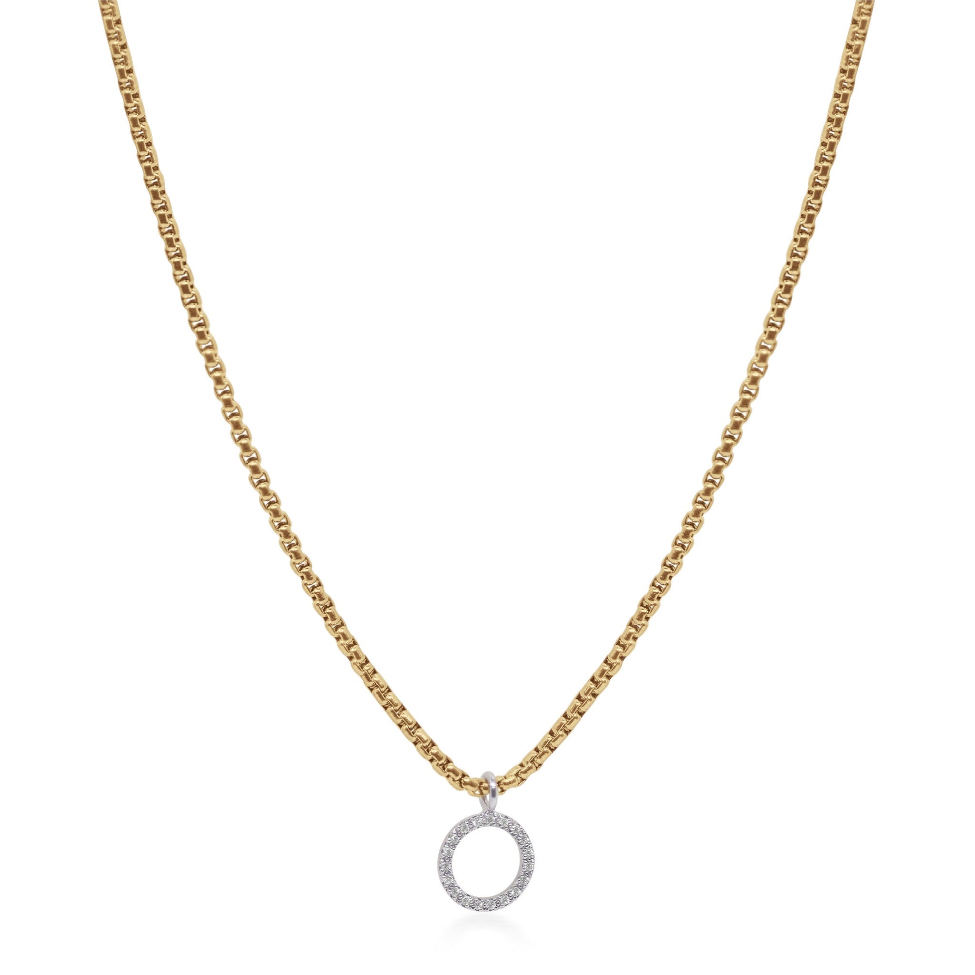 A classic box chain necklace with an open circle pendant of diamonds.
