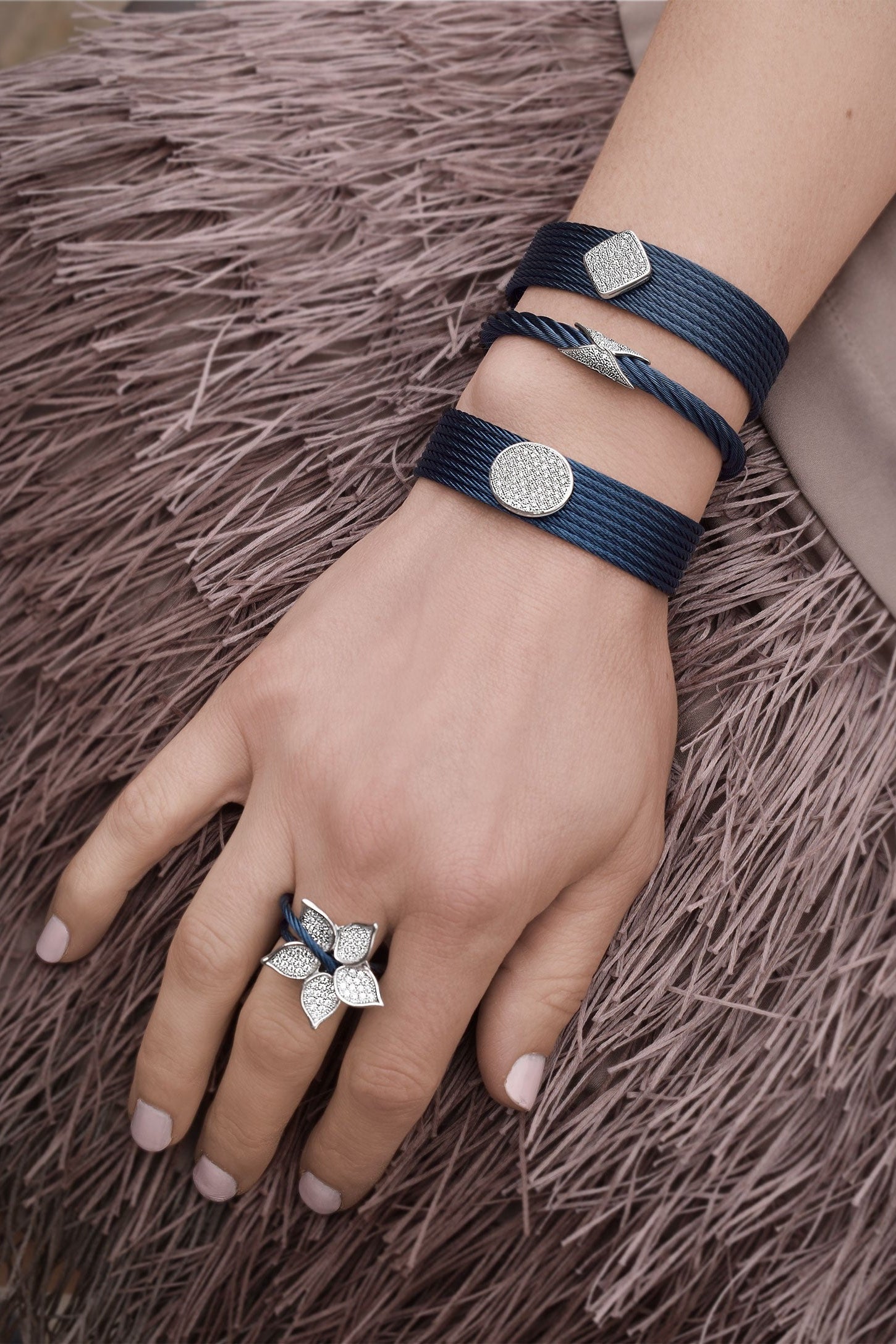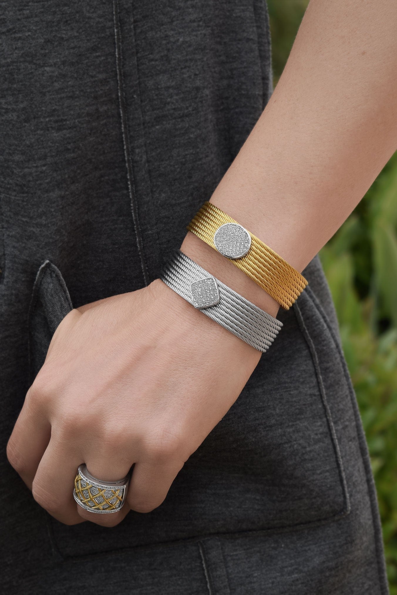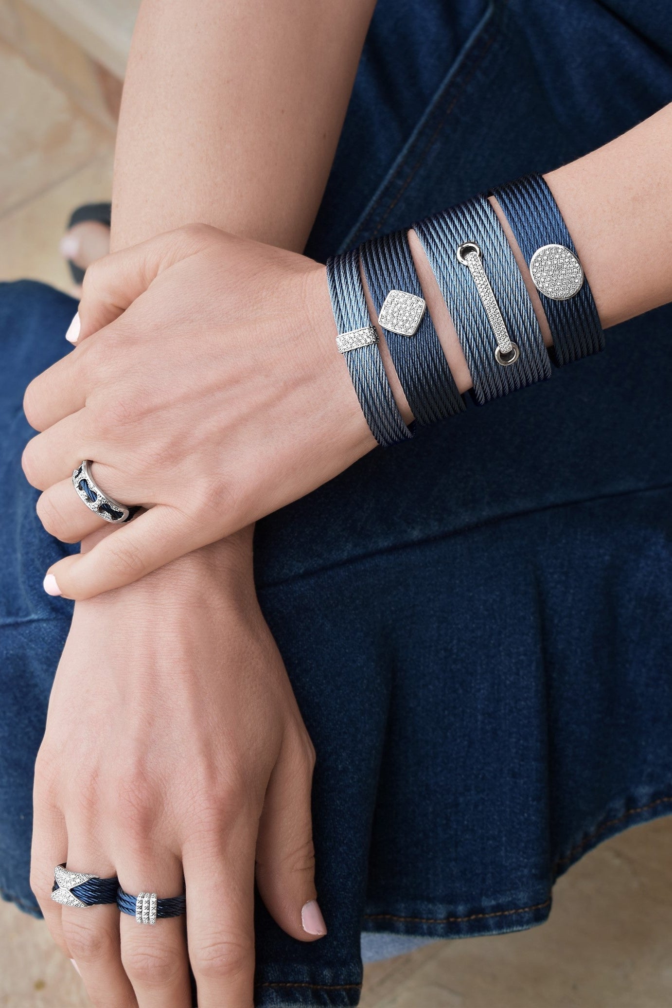 A set of 5 cuffs with one square station with diamonds. Station interchanges between all cuffs for a unique look everyday.