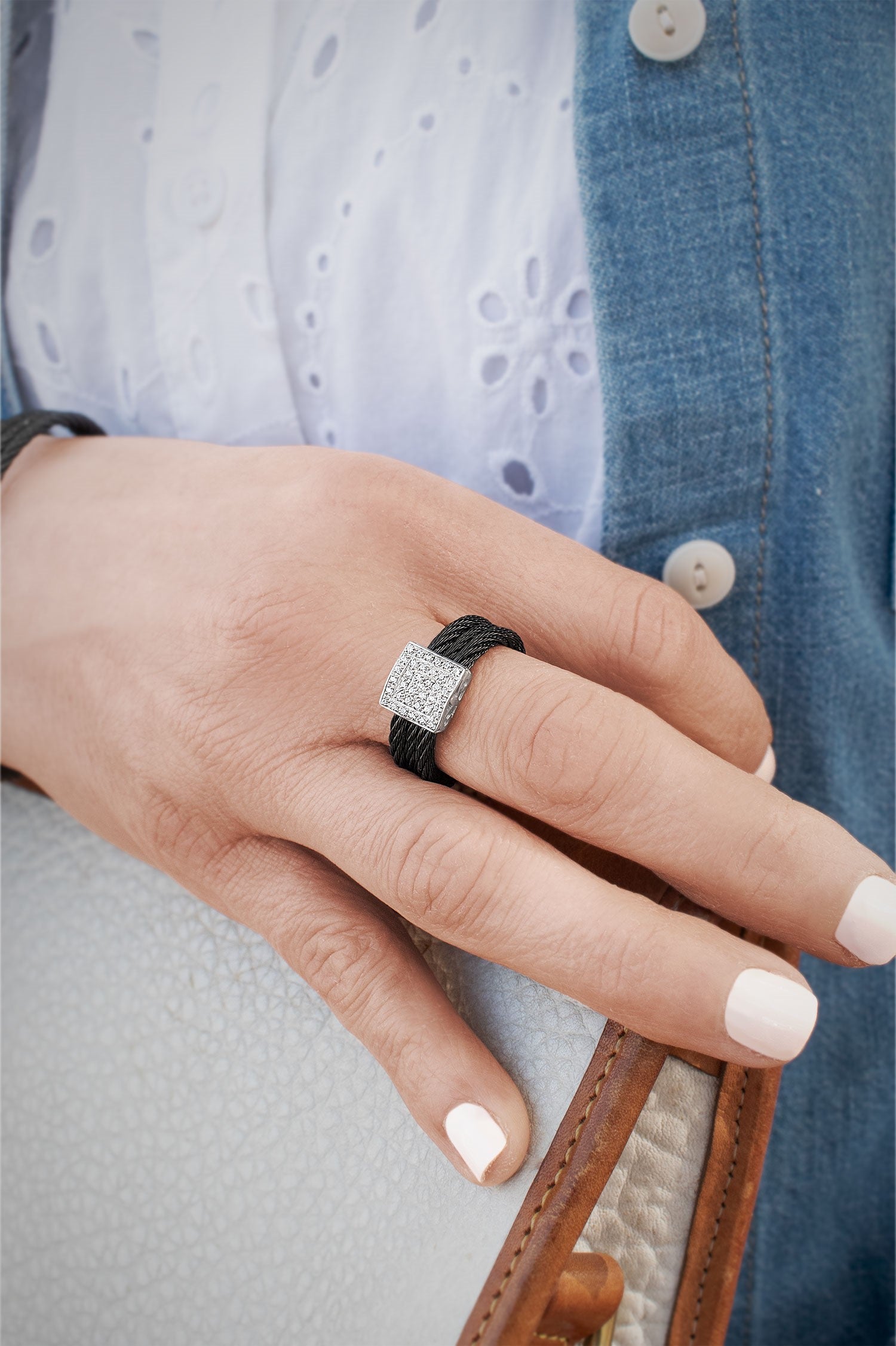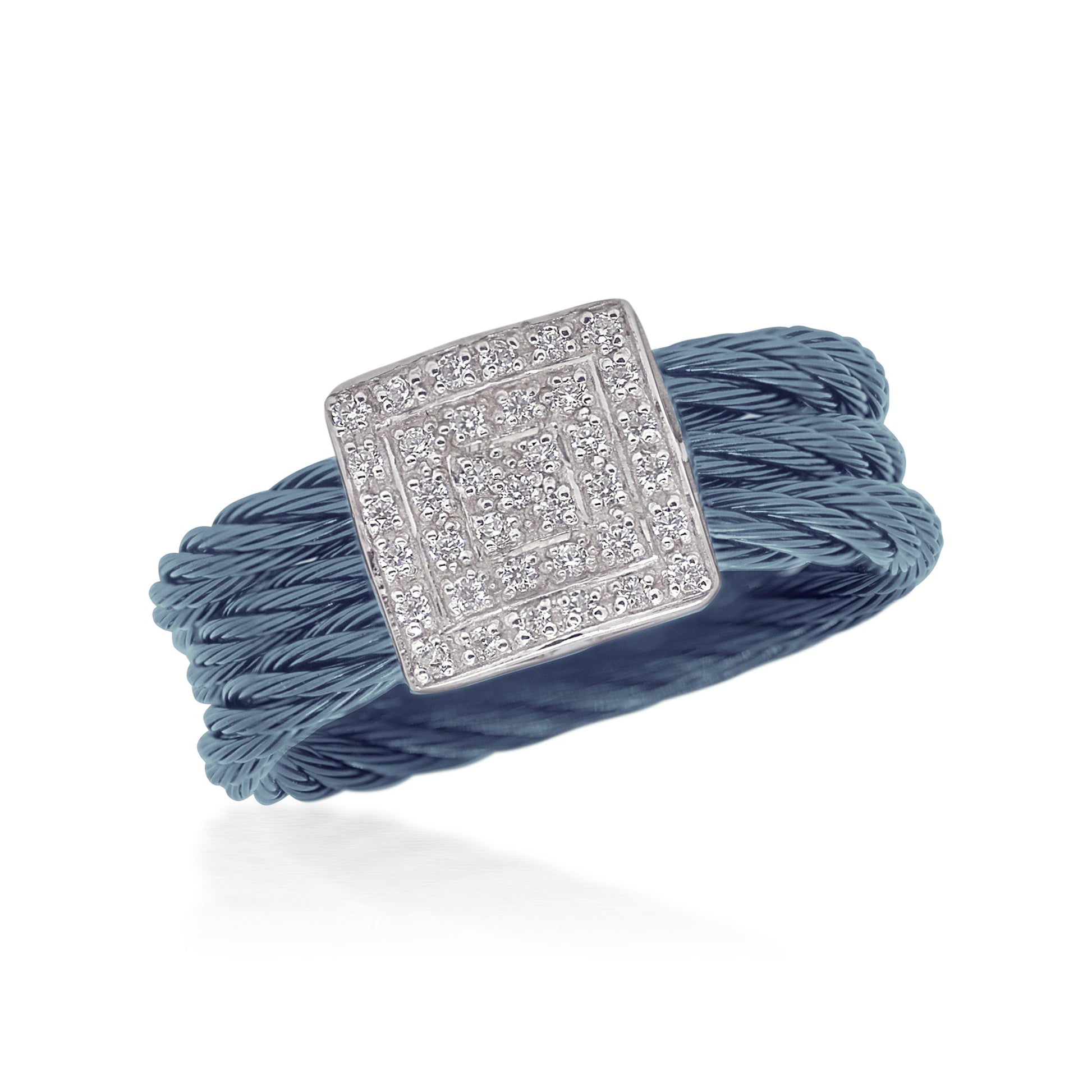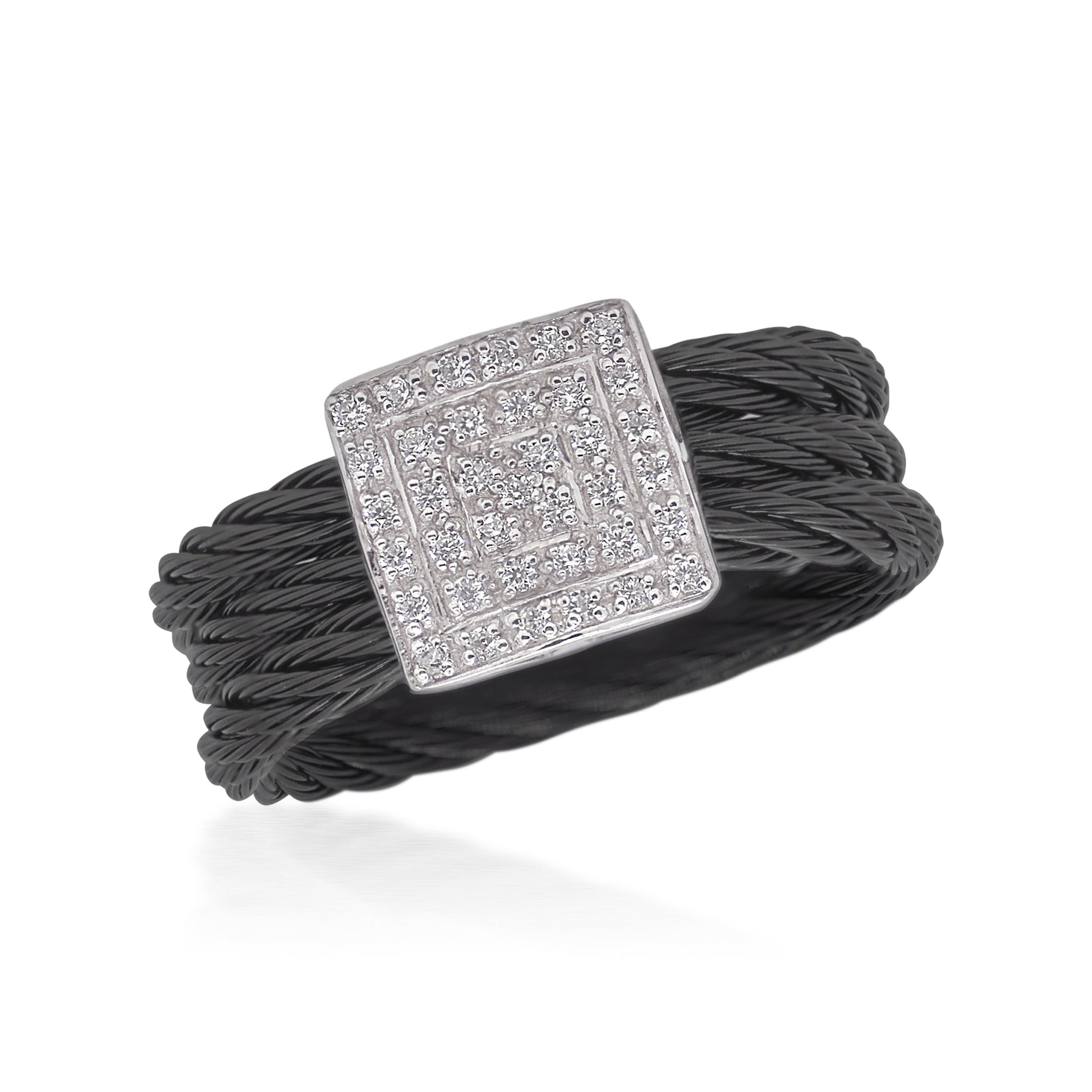 Three rows of cable are fused together with a square station of diamonds and 14kt gold.