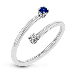 This is a modern and elegant open band ring crafted in a sleek white gold metal. The band is minimal and gently curves into an open spiral design, with each end featuring a distinct gemstone.