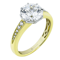 This engagement ring features a striking round center stone set in a white gold head atop a yellow gold band. Channel-set diamonds along the shoulders and a delicate scroll pattern inside the shank add a refined, elegant touch.