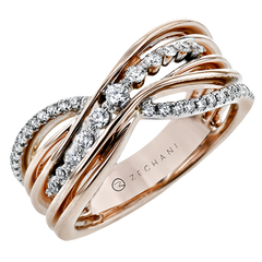 This ring features an elegant crisscross design with intertwining rows of polished rose gold and sparkling diamonds. Its flowing, layered style creates a modern yet timeless statement piece.