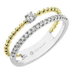 This two-tone Zeghani ring beautifully blends yellow gold beadwork with a sleek white gold diamond band. A single accent diamond bridges the two rows, adding a playful yet elegant touch to this modern design.