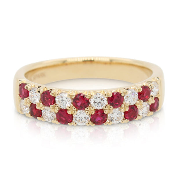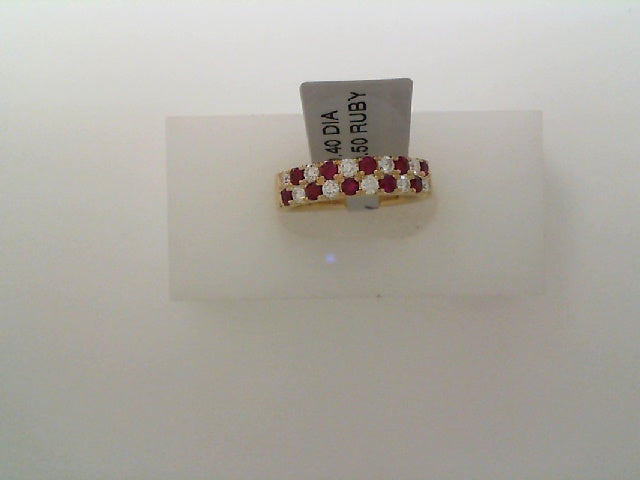 Lady's Yellow 18 Karat Shared Prong Ring Size 6 BY SPARK CREATIONS R 6563-R/64219 10=0.50tw RD RD Rubys10=0.40tw Round G/H In Color SI-1 In Clarity Diamonds