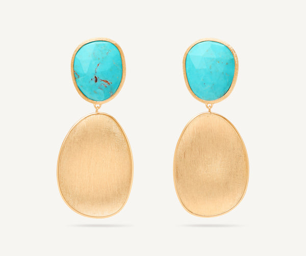 These drop earrings effortlessly combine bold volume with everyday elegance. The 18K yellow gold leaves, meticulously hand-engraved using the ancient Florentine technique, are adorned with two natural square-faceted turquoise stones. The perfect accessory to add a pop of color to any outfit.