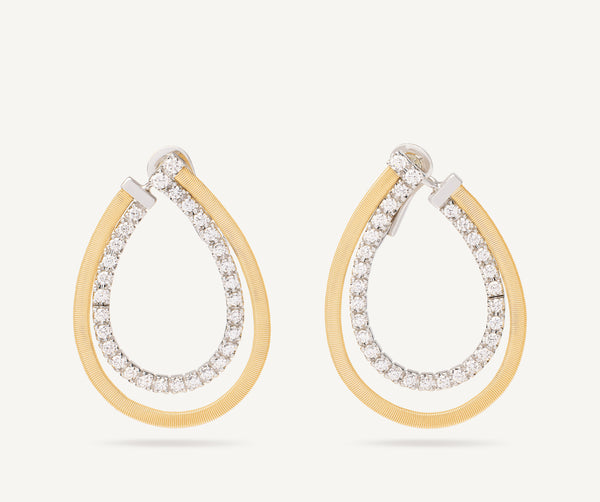 Delicate and linear in design, these 18K yellow gold flat-coil earrings in attractive teardrop shape are embellished by brilliant-cut diamonds. Elegantly sophisticated, they are the perfect choice to illuminate the face.