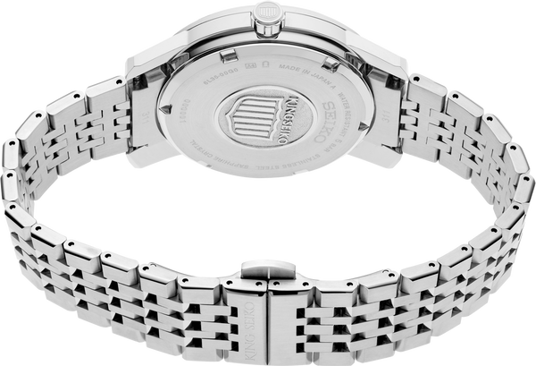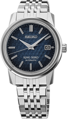 From the King Seiko Collection. First introduced in 1961, King Seiko became one of Seiko’s most technically innovative and stylish brands, noted for its sleek, dignified profile Reflecting traditional aspects of Japanese Ukiyo-e, a genre of art that flourished from the 17th through 19th centuries, the dial of this stunning timepiece expresses “Kameido Blue,” dramatically showcasing a deep blue gradation and a turtle shell pattern, inspired by the turtles in Kameido, Japan, the birthplace of King Seiko. Echoing the 1965 original, the patterned blue dial features diamond cut hands, meticulously cut dimensional indices with a separately carved 12 o’clock marker, and a date calendar. Designed for sophistication and comfort, this elegant timepiece is engineered with a slim 10.7mm case, as well as sharply delineated case and crystal edges. The 26-jewel 6L35 caliber movement, with a frequency of 28,800 vibrations per hour, a power reserve of approximately 45 hours, and manual winding capability, offers such features as a bi-directional winding system and rapid date change mechanism while maintaining a slender profile. Crafted of stainless steel, with super-hard coating and the combination of mirror and hairline finishing characteristic of the original King Seiko, as well as the King Seiko crest on caseback and crown, this elegant timepiece also offers a box shaped sapphire crystal with anti-reflective coating on the inner surface and a deployment clasp with push button release. 5 bar, 50M Water Resistant