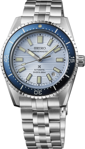 Prospex Marinemaster 1965 Heritage Diver's Watch. Distinguished by its blend of functionality and aesthetics, this extraordinary timepiece, part of the first globally launched watch series to bear the “Marinemaster” name, features the first see-through screwdown caseback on a Seiko diver’s watch, as well as an elegantly chamfered case and bezel and a flexible double-curved bracelet for a comfortable fit. Based largely on Seiko’s 1965 diver’s watch, the first made in Japan, this exceptional timepiece extends the Prospex tradition of celebrating its rich legacy of innovation in high-intensity timekeeping by re-creating and re-interpreting signature achievements with today’s finest technology and materials. Visible beneath the caseback, the thin, but exceptionally accurate, 26-jewel 6L37 movement beats at a frequency of 28,800 vibrations per hour, and provides a power reserve of approximately 45 hours and manual winding capability. Framed by a uni-directional rotating elapsed timing bezel, the distinctively patterned blue dial offers LumiBrite hands and markers. As rugged as it is stylish, this premium diver’s watch, following ISO standards for scuba diving, is crafted of stainless steel with a durable super-hard coating and features a box-shaped sapphire crystal with anti-reflective coating on the inner surface, screwdown crown, and a tri-fold push button release clasp with secure lock and extender. Packaged in a special collectors’ box. 200m Water Resistant