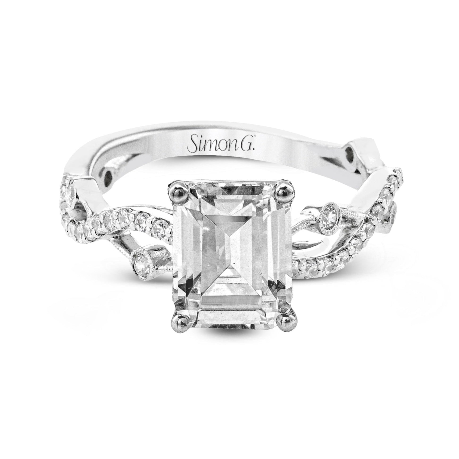 This stunning engagement ring features a modern, intertwining design set with shimmering white diamonds.