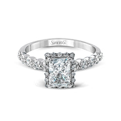 This beautiful ring features a contemporary design with a halo and shank adorned with sparkling diamonds.