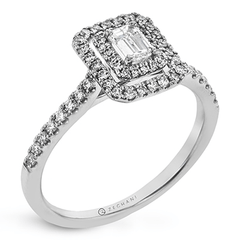 This ring highlights a striking emerald-cut center stone framed by a double halo of brilliant diamonds. Its tilted square design adds a modern twist to a timeless classic, finished with a diamond-accented band for extra sparkle.
