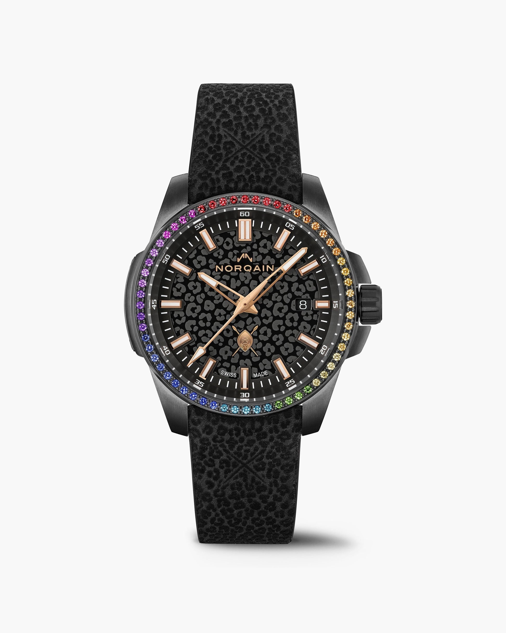 Designed in collaboration with NORQAINER and wildlife ambassador Dean Schneider, this 40mm Independence makes an unforgettable impression with its leopard-print pattern on the black dial. 10% of the earnings of sales from this timepiece will be donated to the Hakuna Mipaka Oasis. This timepiece is limited to 100 pieces.